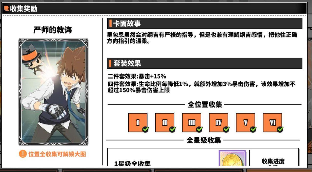 严师的教诲四件套效果为自身生命值降低额外增加自身暴击伤害,适合泽田纲吉?未来篇、泽田纲吉?戒指篇,配合两件吸血卡或者暴击卡可以做到绝地反击,主要用于pvp,也可被擅长控血的玩家用于打究极模拟战,看个人兴趣。
