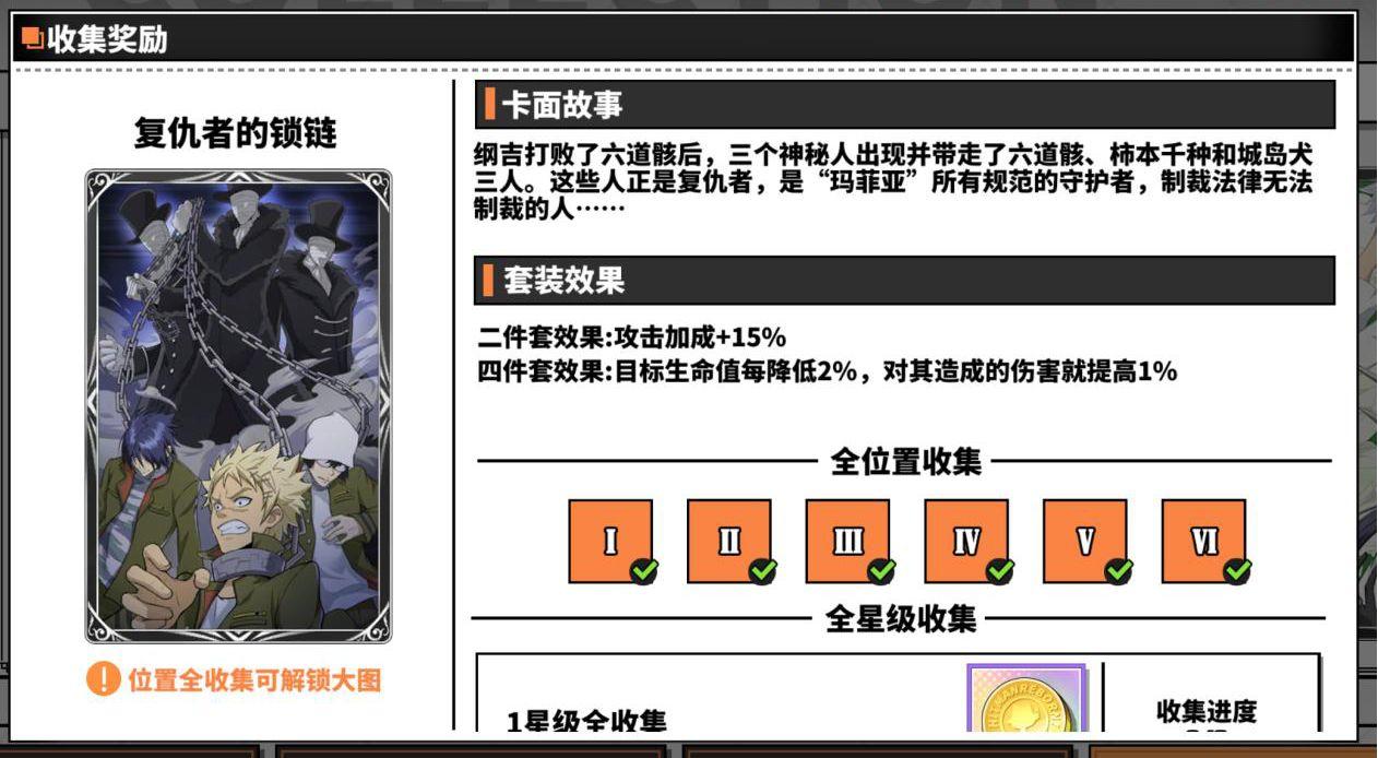 复仇者的锁链四件套效果是随着目标生命值降低,对其造成的伤害增加,最多49%,这张卡适合打后手收割目标的输出型角色,比如狱寺隼人?未来篇(该角色也适合打先手)、贝尔菲戈尔,适用pve和pvp。