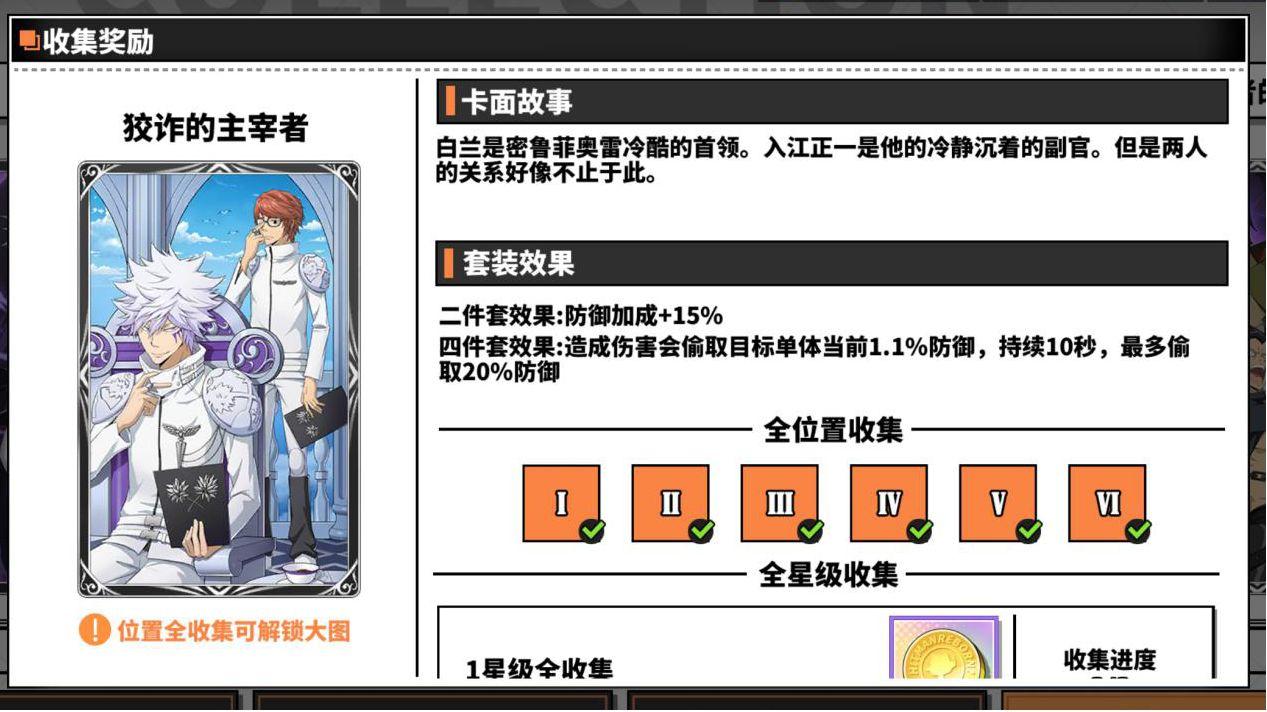 狡诈的主宰者四件套效果可以偷取受击目标的防御并且将对方防御转化到自己身上,比较适用于初级模拟战、究极模拟战、角色试炼,跟XANXUS的戒指特性配合有多重优点:既可以给自身加防御又被戒指转化为攻击加成。在面对高防御boss的时候如果自身输出角色命中率不足,可以用库洛姆带一套狡诈的主宰者来对boss进行防御的削弱,配合斯库瓦罗被动破防效果以及带暗中较量的输出型角色打出巨额伤害快速击杀boss。