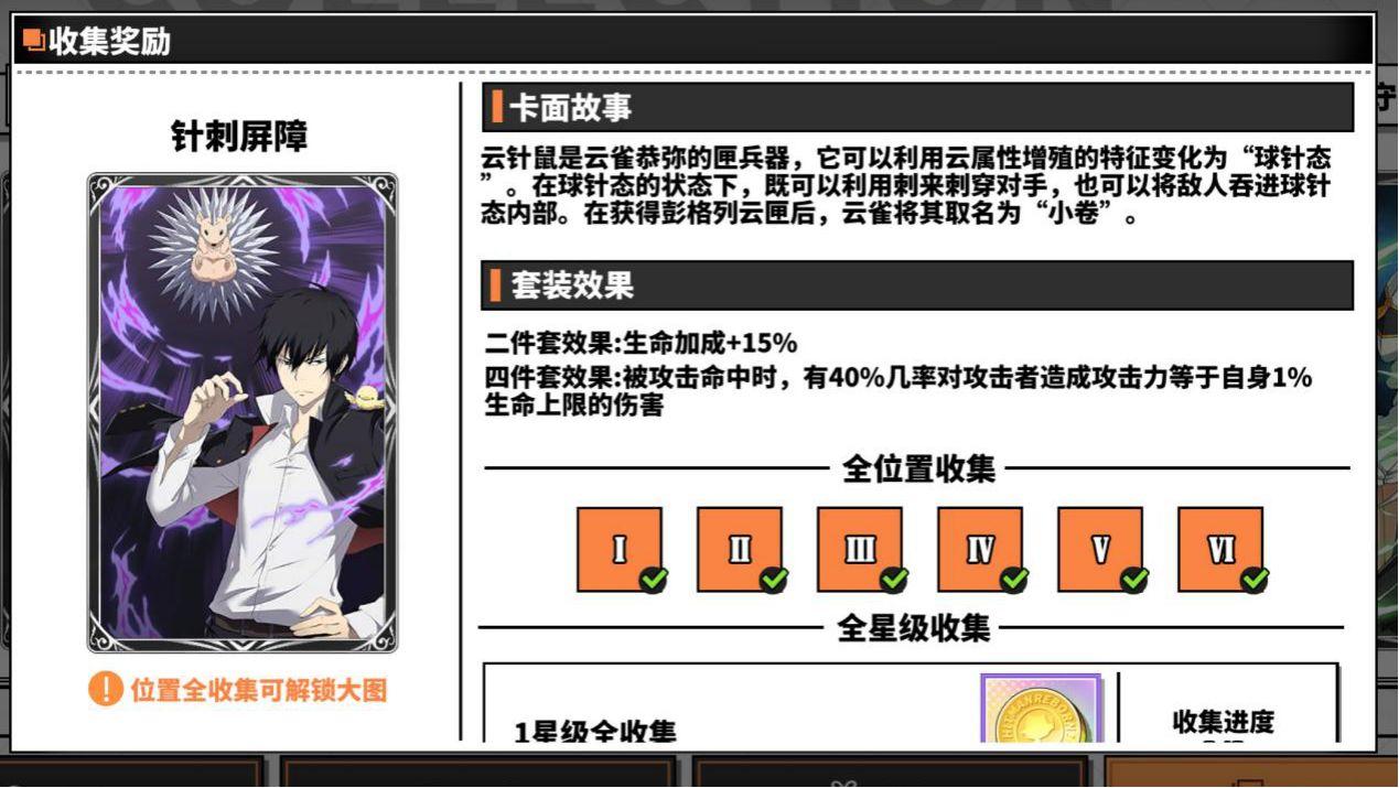 针刺屏障四件套效果被攻击命中有一定几率向对方反弹自身一定生命上限百分比的伤害,比较适合笹川了平这种生命值高的角色,在面对库洛姆、山本武?未来篇这种攻击段数多且频繁的角色时比较有作用,这套卡主要用于pvp,在挨打的时候让对方受伤害。