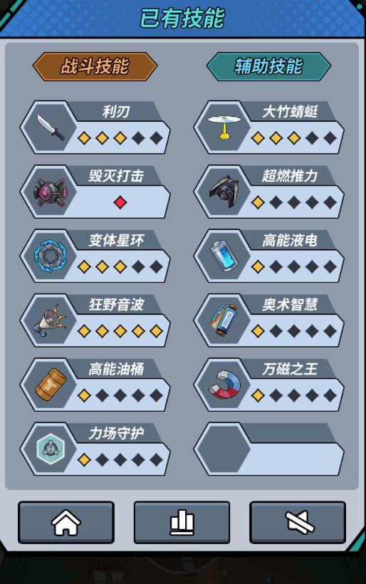 相比武器,技能种类就比较多了,燃烧瓶、狂野音波、高能油桶、火箭弹、粒子光束、无人机等都是比较好用的技能,特别是狂野音波和无人机双子星,当拥有无人机α和无人机β之后,怪物基本就很难进身了,并且当两个无人机进化到满级之后,会合体成为“毁灭打击”满屏的能量弹飞射,安全感满满。