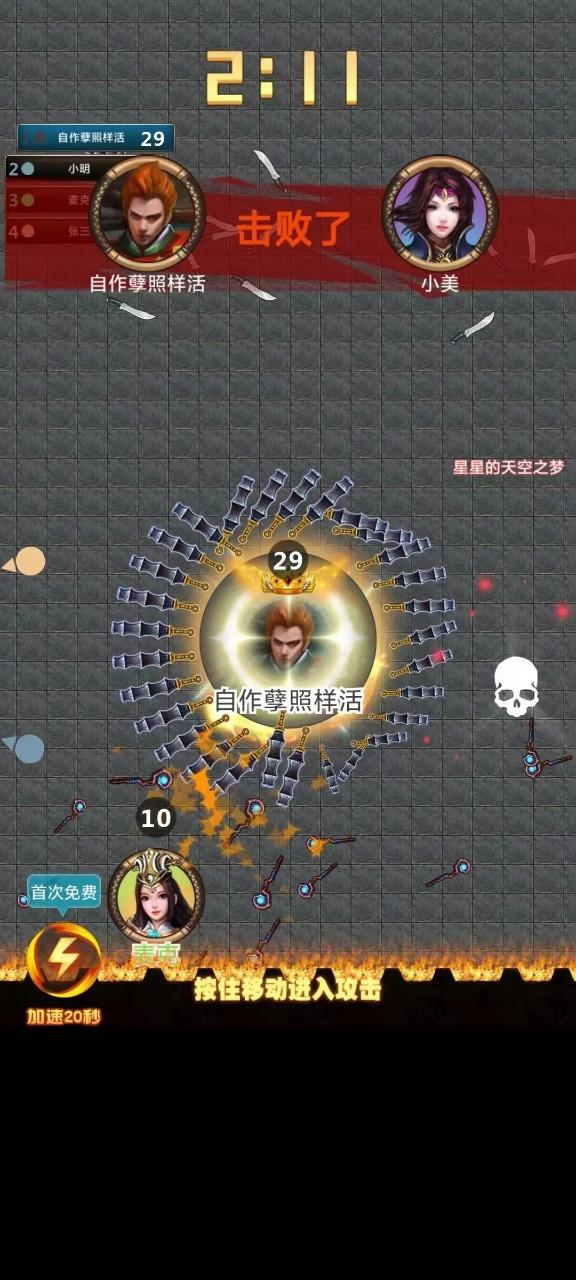 刀剑争霸是一款io玩法的战斗游戏,玩家可以在地图上收集各种武器,并自由选择技能,跟对手进行对战,通过消灭对手来快速提高自己的实力,游戏中有多个不同的角色可以选择,技能也很丰富,合理搭配能够产生特殊的效果哦。