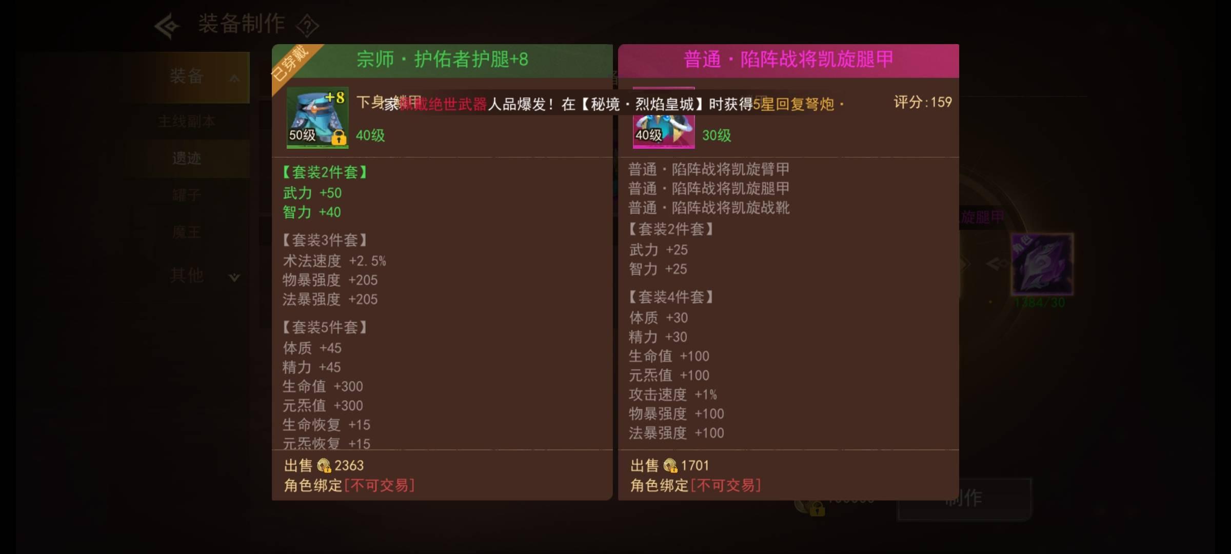单件属性上明显粉色装备要强于宗师装备,所以在装备选择上不要单纯的跟风选择宗师。合理的装备选择更能平滑的度过前期,让角色快速成型。