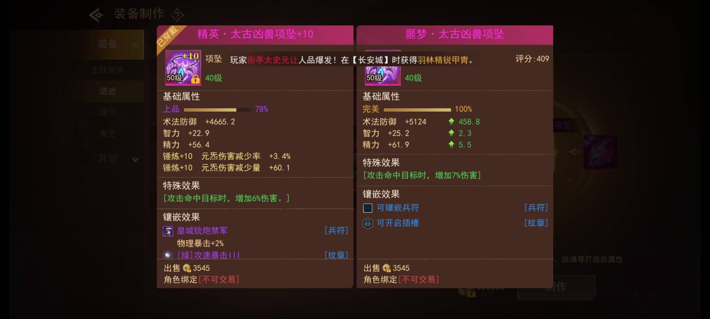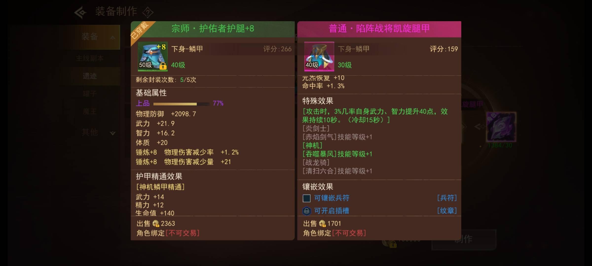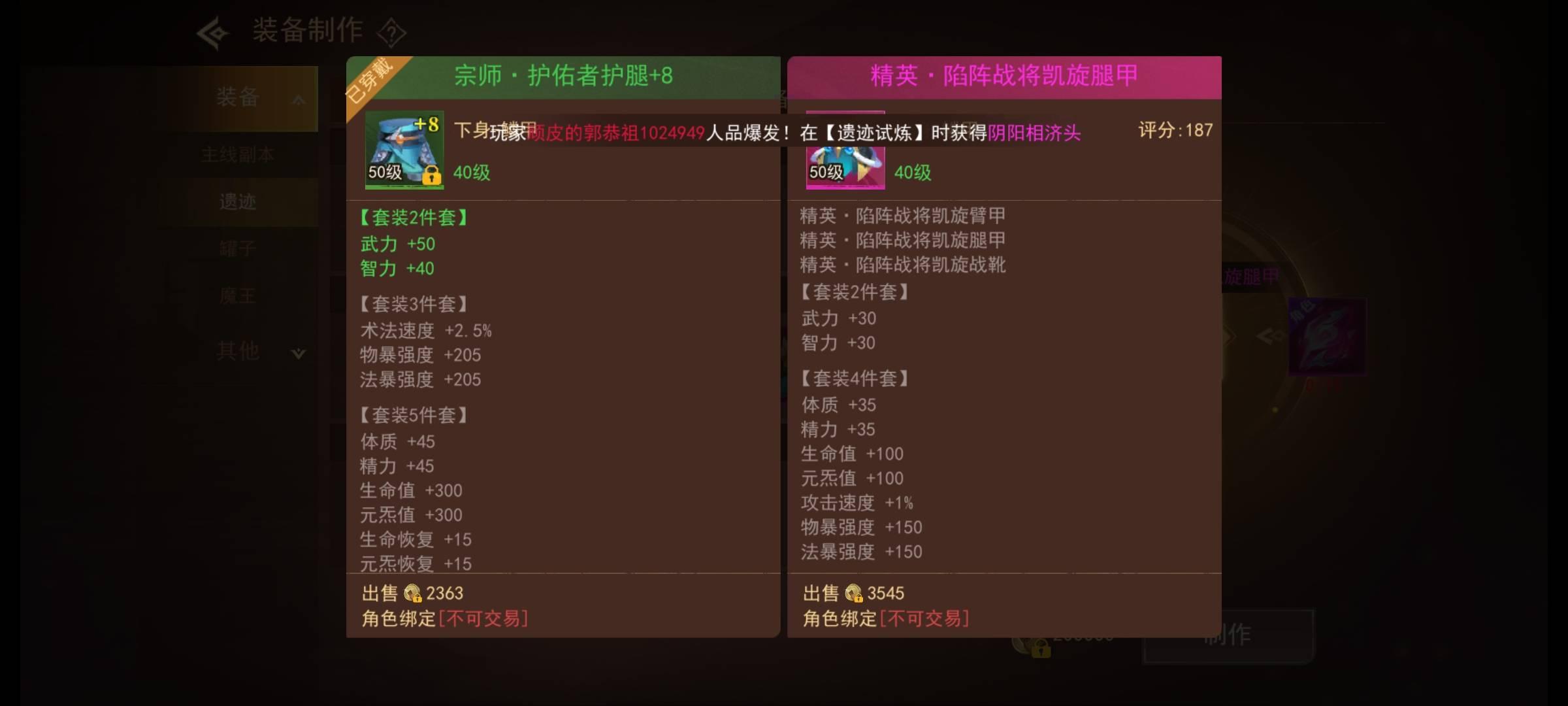 所谓的2+2也就是我们只保留两件套装的属性,选择两件40遗迹+两件50遗迹或者两件50遗迹+两件噩梦,当然噩梦比较难升级,所以一般建议两件40+两件50。我们只保留两件套属性,也就是只叠力量和智力,直接提升自己的伤害,换来的是血量和蓝量以及防御略低,无伤大雅。(ps:40的遗迹裤子和50的遗迹衣服加40技能,2+2的时候可以选择,有条件可以将两件40换成宗师套,区别不大,有略微提升。)至于衣服为什么要带50史诗散件,我们看一看属性。