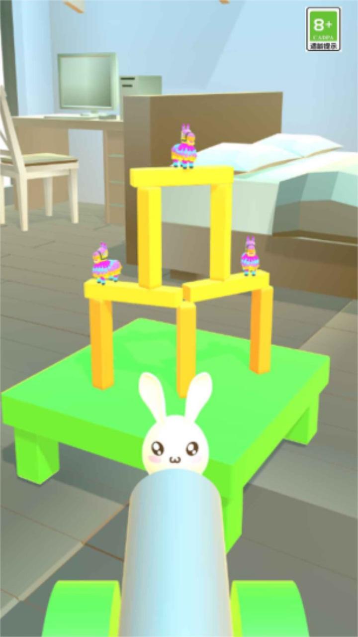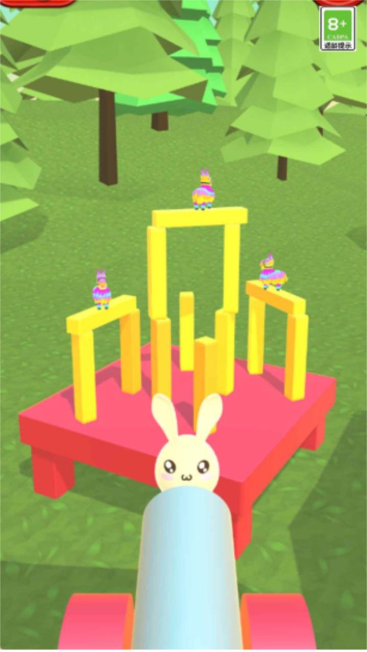 在这里玩家需要用手中的小兔子将放在高塔上的美洲驼给打下来,游戏操作简单,只需要轻轻点按,就可以将小兔子扔到你想扔的地方。