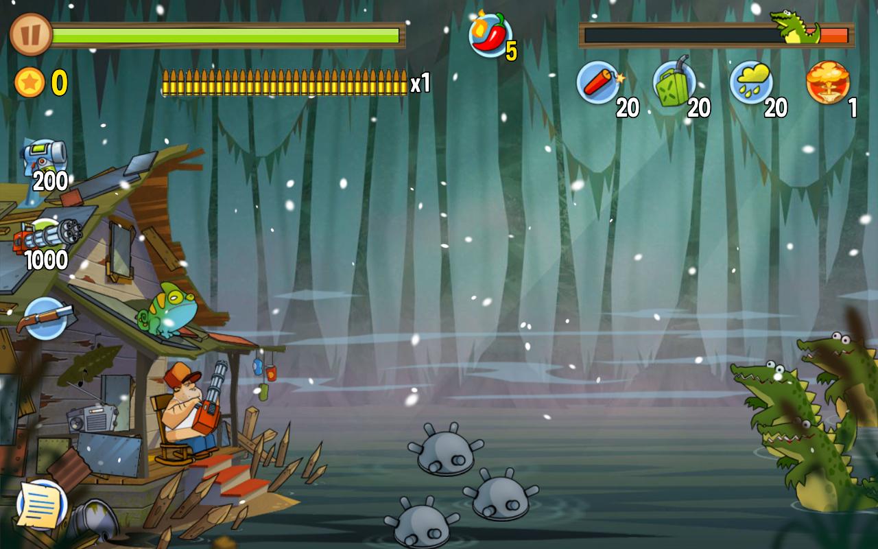开发商的设计非常贴心,每个细节都把控的很好,所以并不是每种动物的前进速度都相同,游戏会根据每个动物的不同特性所设计它们前进的速度,例如鳄鱼速度快一些,乌龟自然也就慢一些,不过当它们一大波袭来时,也不用太过紧张,因为沼泽里除了会出现动物之外,还会有许多给力的小道具,帮助大叔消灭它们。