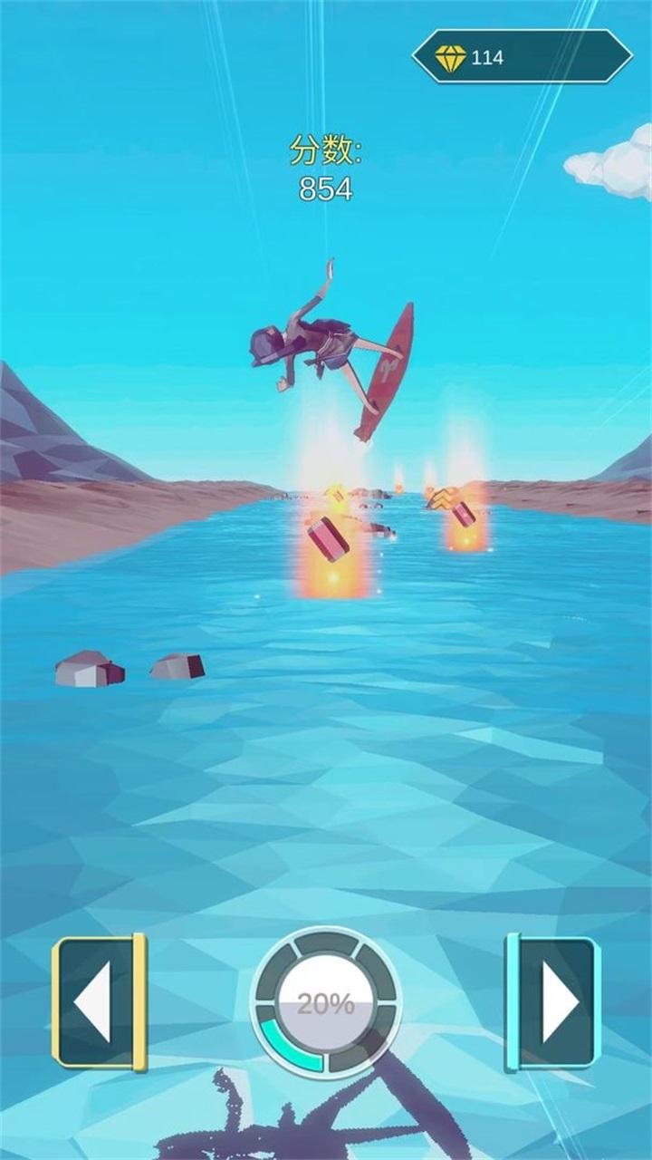 喷射冲浪是一款动作冒险游戏,玩家通过操控角色在海上冲浪,避开海上的一切障碍物,点击人物角色做出各种特技动作,非常有趣。这是一片无人能征服的海域。有凶猛的海浪,有原始的鸟类,有海洋的霸主,也有深海的刺客。你有勇气挑战吗?