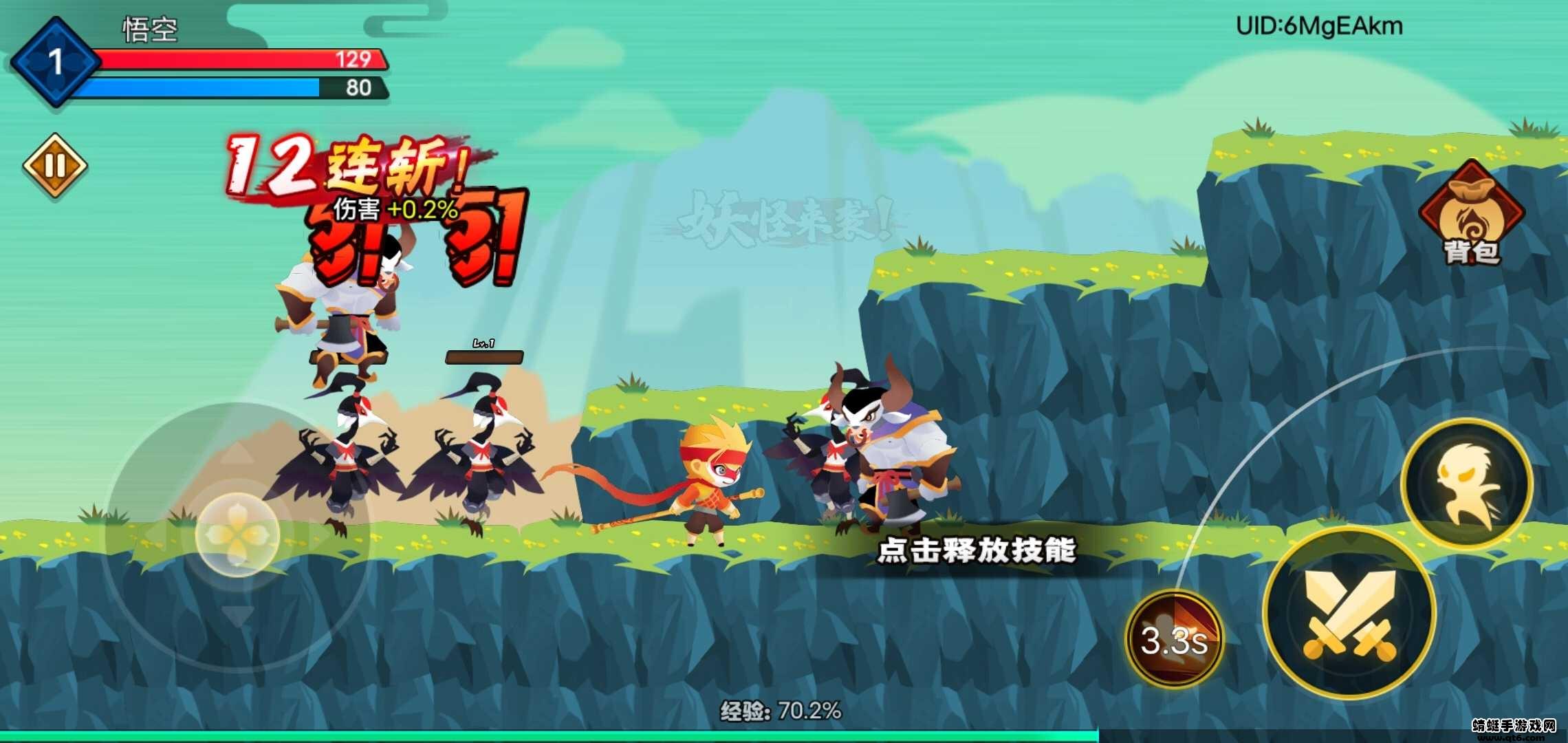 游戏中的角色技能有裂空击.五味真火.狂应乱舞等酷炫技能,帮助玩家迅速完成任务,实现击败敌人的终极目标,同时当玩家点击技能攻击时会伴有炫酷的特效出现,增强游戏的动感和体验性。
