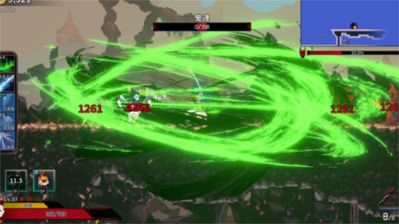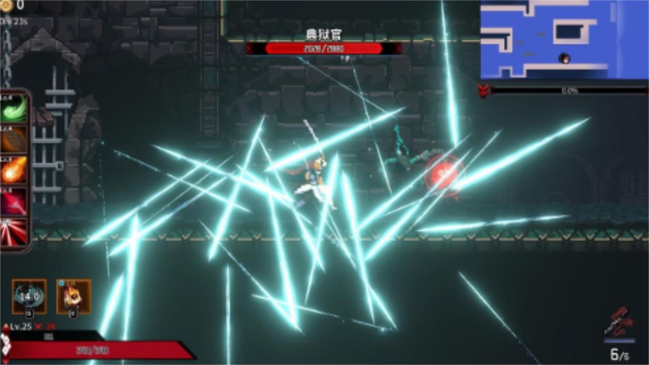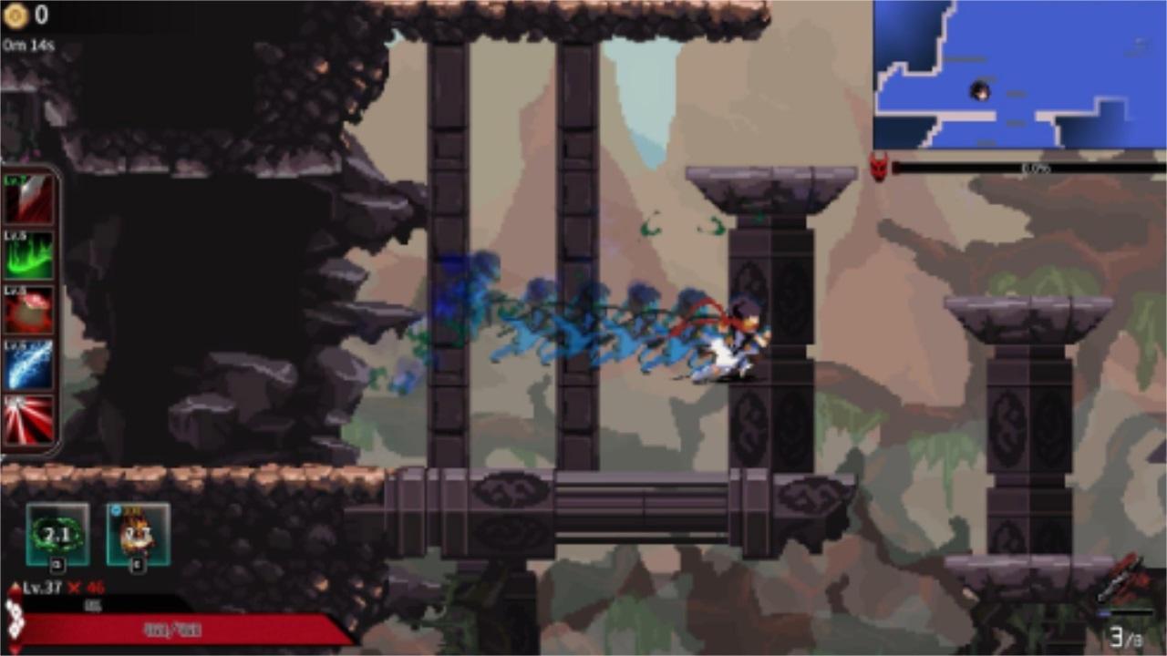 2、当然,在游戏途中打小怪获取经验,而打大怪则需要打败足够多的小怪,而在沿途玩家可以解锁宝箱里可以获得金币和技能等道具。从操作方面来看,游戏中有冲刺,跳跃,下蹲,攻击等功能,其中连续按两次跳跃可触发二段跳,连续按普攻可触发连招,高处按下蹲可造成下落伤害等。