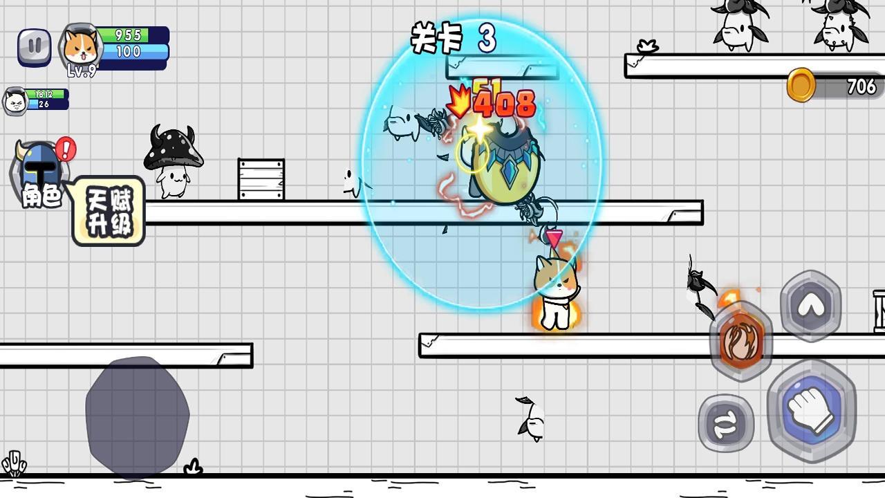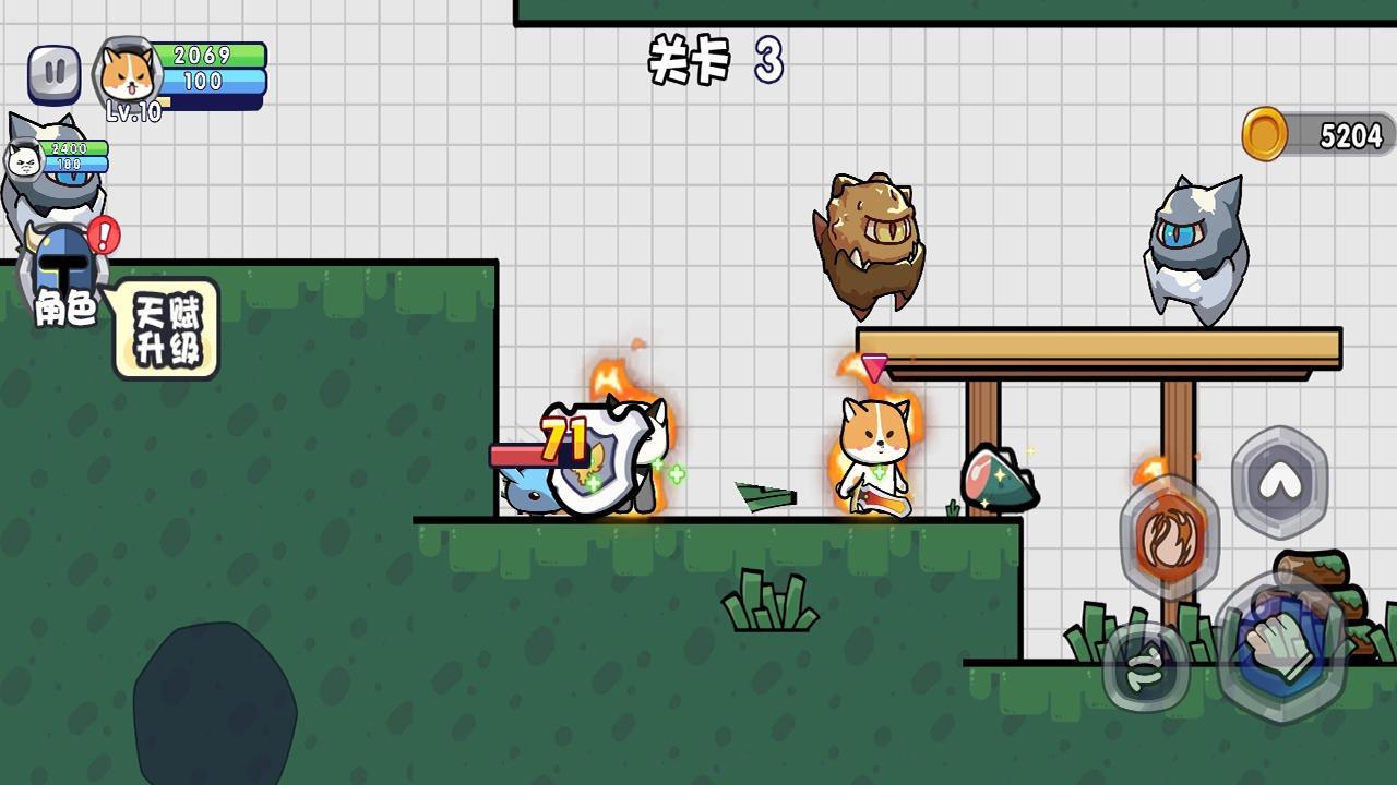 勇敢小喵是一款横版闯关冒险游戏,在这里玩家将扮演一只勇敢的小猫咪,您需要带着好友进行闯荡,遇到敌人勇敢战斗,一拳一个小朋友,将敌人打得落花流水,并学习新的技能和解锁更加强力的武器,这样才能战胜boss。