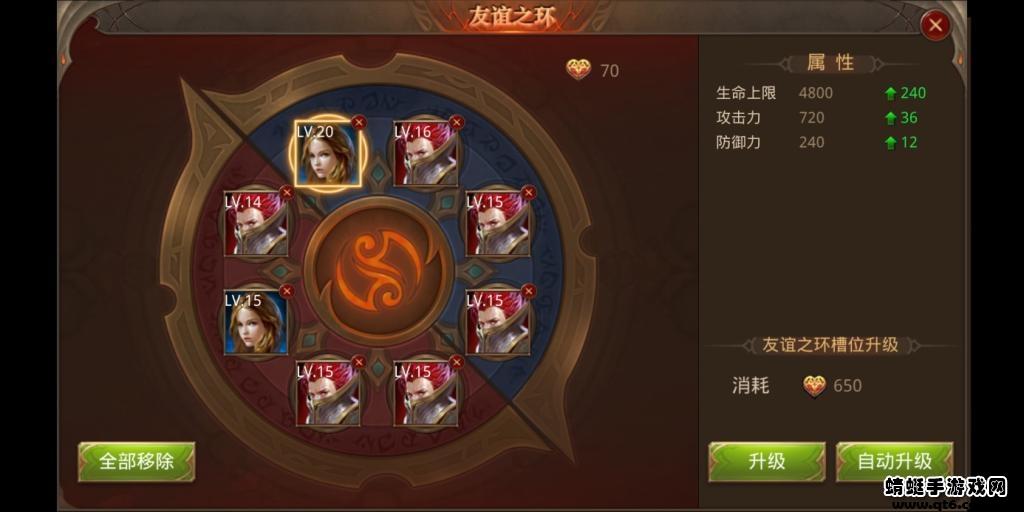 友谊之环对玩家属性起一定作用,玩家属性的强大友谊之环也是不可缺少的一部分。友谊之环槽位通过消耗友谊印记进行槽位升级,槽位中可佩戴普通好友和好友关系组的特殊好友,普通好友属性加成为105%,好友关系的好友属性加成为120%,如果友谊之环中佩戴有好友关系的好友被对方删除好友后,友谊槽位中的关系会变为普通好友关系,好友属性加成也会下降或者消失。所以,删减好友一定要谨慎操作。