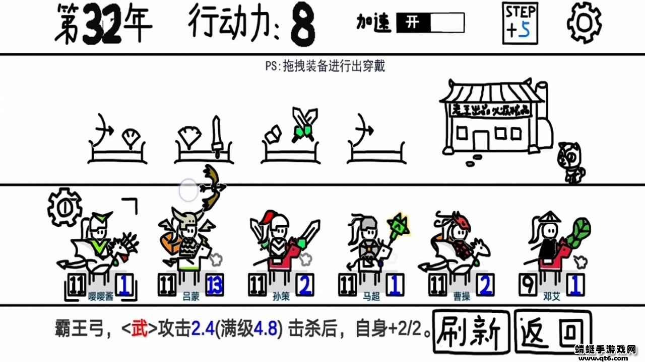 行动力为操作步数,酒馆→招募英雄(英雄分文武、基础属性就两个:攻击和防御),武器店→+攻击,服装店→+防御,马场→+闪避,南北货→药品(+血+基础属性,以及其他奇奇怪怪的东西),初始抽卡大概率会随机给个英雄。一般初始抽卡大概率会给英雄,当然给行动力也没关系,都是要在酒馆进行招募的,招募后按照刚刚那些说明给英雄加属性,(噢,三国主题,三国知名人物属性都蛮高的。另外注意每一步操作都会消耗行动力,所以一定要想好再动),然后点击“下一年”就是进入战斗,战斗胜利会进入下一年并给行动力,继续招募、养成,哦对,战斗也是会加经验的,点击页面左侧的按钮可以看各英雄属性以及武器等级。