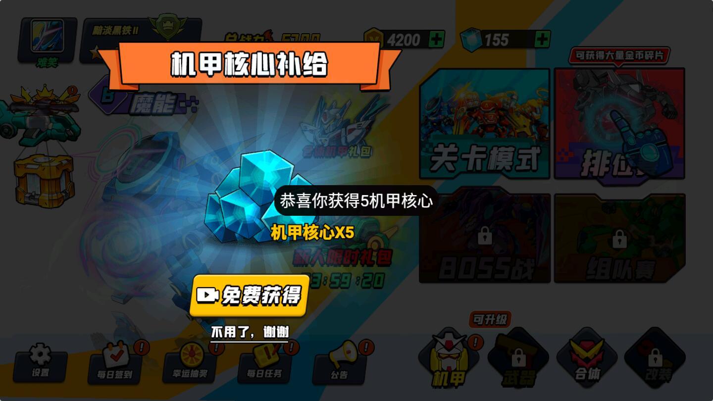 机甲世界大战游戏给大家破解成了免广告获得奖励,这是一款以机甲为特色的动作格斗游戏,您可以组装自己的机甲并进行升级,使用各种技能来消灭怪物,游戏有多种挑战模式可以玩,而且机甲的形态也会变化。