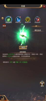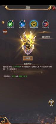 冒险家角色等级达到18级开放圣器系统,游戏内达到VIP2、VIP4、VIP6、VIP8,或区服开放3天、7天、15天、30天解锁战争漩涡、神秘法杖、振奋刃甲、深渊战斧。
