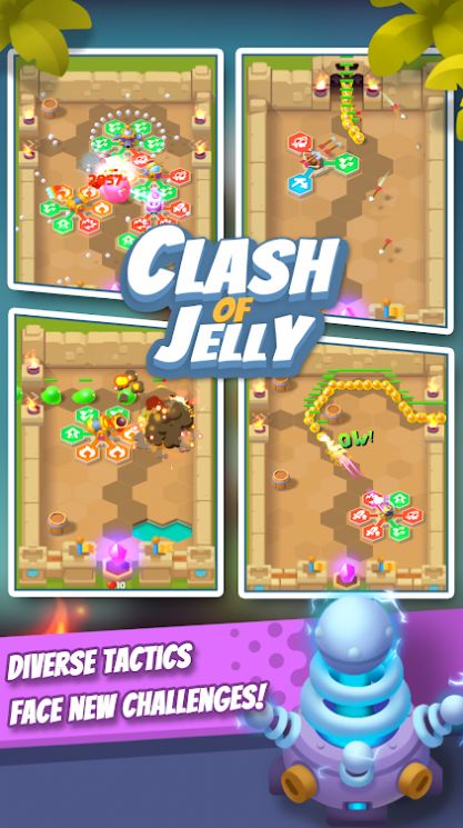 果冻冲突是一款玩法内容非常丰富多彩的放置塔防游戏,游戏的界面设计的非常简约界面,玩家需要滑动手指操控关卡中的炮台对准怪物进行精准打击,将两个完全相同的炮台进行合成,还能大大提高炮台的战斗实力,可以轻松完成更多不同的挑战任务哦!