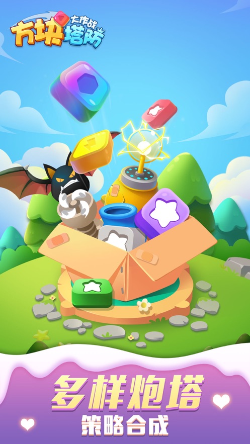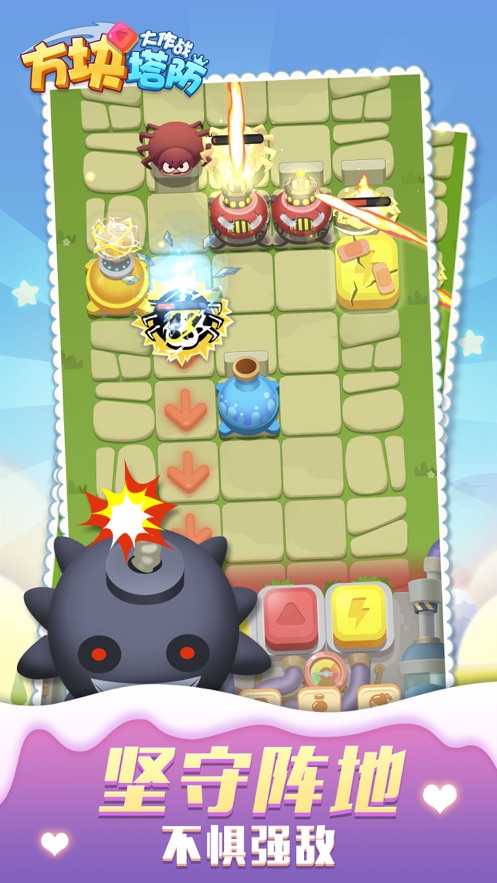 3、玩家利用方块来合成防御塔,构筑防御工事,阻挡怪物肆意侵略家园,最终守住防御线。