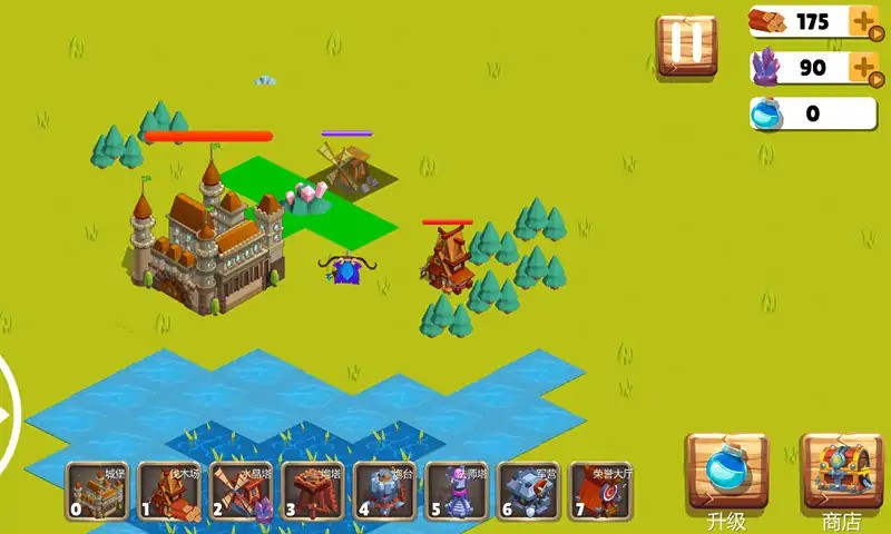 3、玩家可以指挥小兵去伐木采集获取资源,建造建筑,升级防御塔,打造专属城堡。