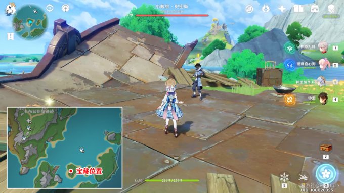 · 藏宝图:位于「万水之源·大枫丹湖」下图所示位置的贝壳中,使用普通攻击将贝壳敲开,拾取里面的瓶子,即可获得藏宝图「罗基·艾威尔森的失落」。