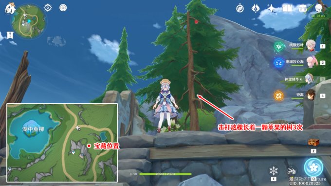 · 藏宝图:位于「万水之源·大枫丹湖」下图所示位置的贝壳中,使用普通攻击将贝壳敲开,拾取里面的瓶子,即可获得藏宝图「鲁热的信条」。