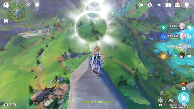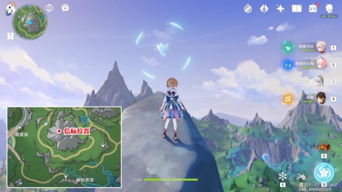 · 对应宝藏:拿到藏宝图后,到下图所示位置的山顶触碰信标,触碰后视角会自动转向北边远处地上的爪型图案岩石。