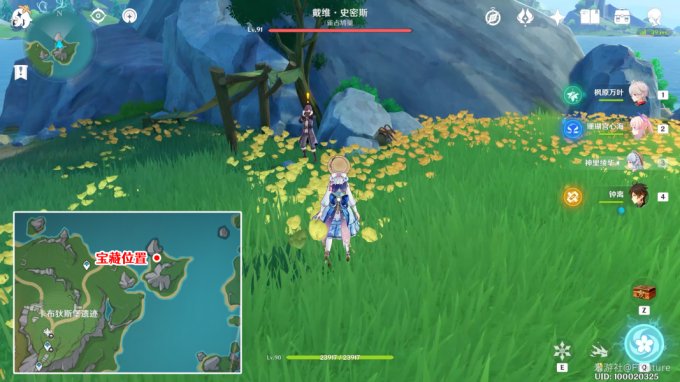 · 藏宝图:位于「万水之源·大枫丹湖」下图所示位置的贝壳中,但贝壳前面有透明屏障阻挡,需要绕到后面,从墙壁上的窗口进去,使用普通攻击将贝壳敲开,拾取里面的瓶子,即可获得藏宝图「利亚姆的高歌」。