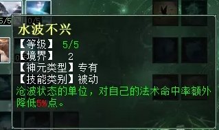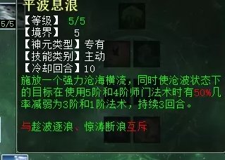大招“平波息浪”,任务、PK通用,强力5法沧波,可让沧波状态下的单位出手时,5法变3法,4法变1法。变相降低其输出和控制力度。