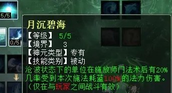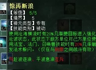 大招“惊涛断浪”是PK专用被动技,使沧波状态的单位用法宝、法门、BB技能(比如舍身)时都会触发法术躲闪。