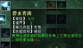 分别是:浪遏飞舟(任务、PK通用,沧波状态下几率无法被牛和被速),水波不兴(任务、PK通用,沧波状态单位对自己降低额外法术命中率),碧水青涛(任务、PK通用,沧波再次秒到有沧波状态的单位,效果加强)