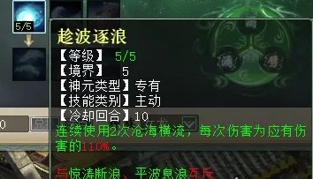 大招“趁波逐浪”是用沧波5法连续秒2次,俗称“沧波好事”,任务、PK通用,首选大招。