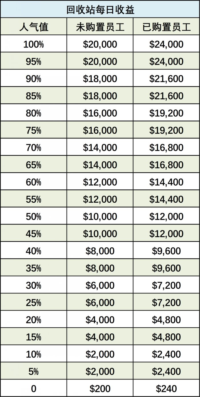 回收站人气没有直观的数值显示,只能通过当前的每日收益来反向推理。它和夜总会一样,也是每 48 min结算一次收益(掉 5% 人气),玩家下线后停止结算。