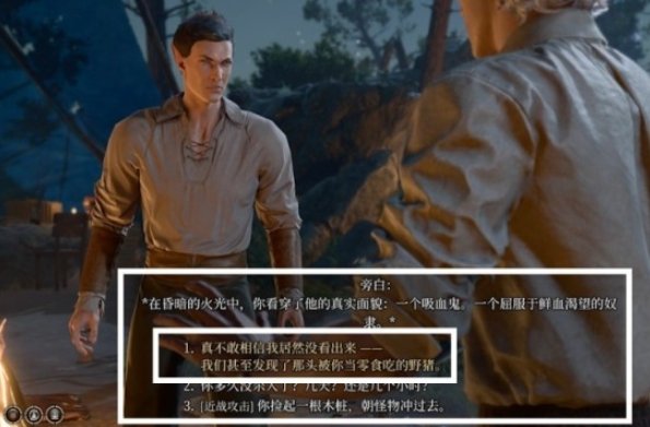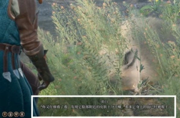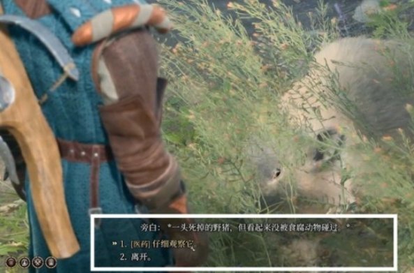 从找到挠挠位置往南走可以发现一只被放血的野猪。这里通过医药选项投骰子成功后可以发现野猪身上只有两个牙印。推荐大家在进入染疫村落之前,可以多长休几次进行角色对话,能更快速推进每个角色的故事进度,有些选项也能提升好感度