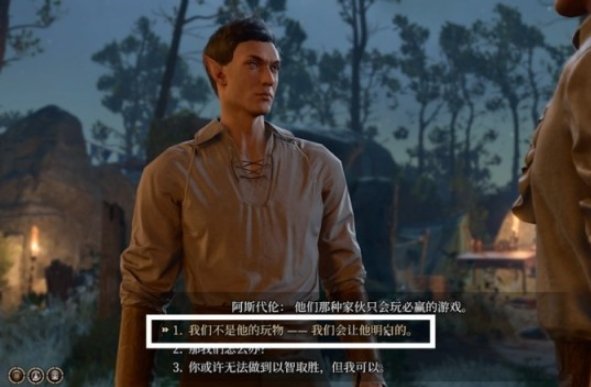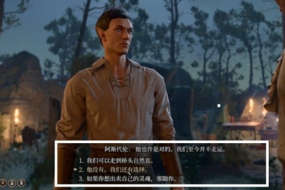 拉斐尔剧情结束后,在营地长休与阿斯代伦对话,选择选项2,这里有个窍门,前期没有队员会同意与拉斐尔的交易,所以尽量表示自己反对意见即可。接着选1说出自己立场,对话完后再次对话,可以发现有询问阿斯代伦个人故事的剧情,但由于好感度不够,所以无法触发下一阶段