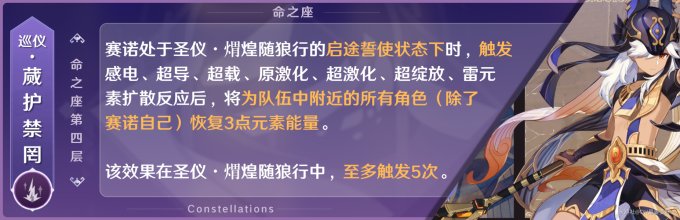 此命之座使得赛诺可以为队友恢复能量,至多恢复15点元素能量,辅助型命座。