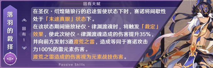 此天赋也为赛诺提供了高频率的雷元素附着,如果元素战技触发了「裁定」,不仅提高了元素战技自身的伤害,且额外多了3道渡荒之雷的伤害。渡荒之雷属于元素战技伤害,也是固定第1、4次伤害有附着能力,因此对于[激化]反应而言,在启途誓使的末途真眼状态下的一次元素战技就能触发两次超激化反应