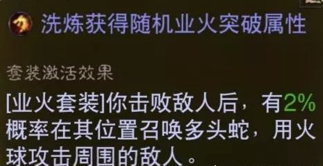 如果身上同时激活多个业火套装,可以增加业火套装触发的概率,但不会增加召唤出的多头蛇数量。