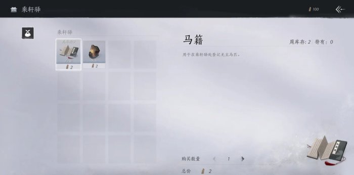 3、先与之对话选择“有什么卖的”,找到【马籍】并购买,2飞马钱一个,每周可以买两个,初始有100飞马钱,飞马钱可以通过在温仆处卖马获得(如果想再买就要100飞马钱一个了)