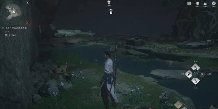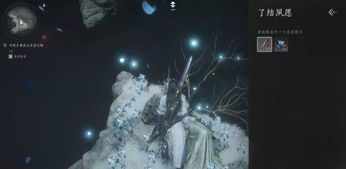 10、跟随任务继续,显示需要帮助月神了解夙愿,前往月神居所摘取【拜月花】和【童子小剑】