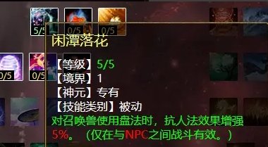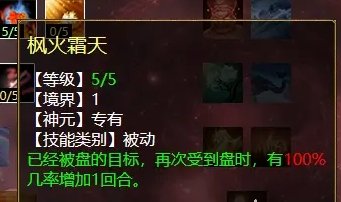 “盘”天赋第一层三个技能,分别是:闲潭落花(任务专用,增强BB人法抗性),枫火霜天(任务、PK通用,增加盘回合数1),布帆无恙(任务、PK通用,被盘单位减少法力伤害)
