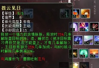 “蔷薇吐刺”和“鸿雁长飞”目前基本没人用,因为在神技“拨云见日”面前毫无亮点,持续回合数短,又同为冷却回合数长的主动技,是它们被嫌弃的最大原因。“拨云见日”的强大处在于,它可100%解除主目标的被控状态,若是天枢点达到85点,点出第二层大招,还可有75%的几率解除主目标的金箍、情网状态,大春、小春都没它好用,称之为神技一点不为过。