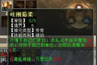 任务型混人选择“吐刚茹柔”,天枢点修炼到85点时,可将大招第二层“染神乱志”点满,混中的比自己快的单位,50%几率不会是闪混,再配合点粹特技“浑水摸鱼”,可谓是混得再稳也没有了。