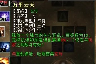 最后是大招,三个技能分别是:吐刚茹柔(任务、PK通用,对比自己慢的单位增加命中率,对比自己快的单位增加忽视混),万里云天(PK专用,混10),意乱神迷(PK专用,强力大混,对主目标增加10点忽视混,但用过之后10回合无法大混)