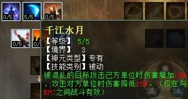 混天赋第三排三个技能,分别是:修魂固魄(任务、PK通用,在战斗中提高人法抗性),千江水月(任务专用,被混的NPC攻击自己增加伤害,攻击玩家降低伤害),舍己成人(任务、PK通用,牺牲自己10%的忽视混,增加全队抗混)