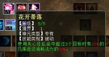 混天赋第一排三个技能,分别是:花开蒂落(任务、PK通用,大混命中3个单位以上几率返还50%耗蓝),心乱如麻(PK专用,混中BB延长一回合),迷花弄影(任务、PK通用,被G时,有几率自己摆脱)。