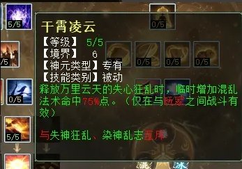 PK型混人必选“万里云天”,混10个单位是混人神技,没有之一,天枢点修炼到85点时,可将大招第二层“干霄凌云”点满,出混10时,增加法术命中75%。以前男人被对面打上主动“乱神”时,有混10也不敢出,生怕浪费了,混不到几个单位,但有了“干霄凌云”护驾,一旦被“乱神”,下回合立马出混10,配合点粹特技“再鼓作气”,基本没有可以躲闪混乱的单位。