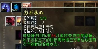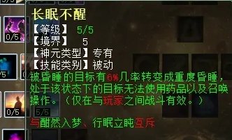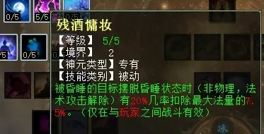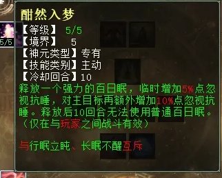 “残酒慵妆”点满5点扣的法量也只有7.5%,比如人物有5万法,7.5%也就是3750法,用处不大,而且是非物理、法术攻击摆脱才有可能扣法,这是什么意思呢,也就是说只有BB“春”、“挥戈回日”、魔族大招盘“拨云见日”等技能解睡才满足扣法条件,该技能很鸡肋。PK睡人可以选择“残酒慵妆”和“眠云衔怒”。任务睡人就选“长夜未央”和“眠云衔怒”,可以兼顾任务和PK。