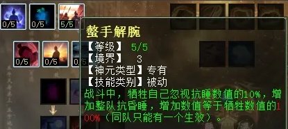 睡天赋第三排三个技能,分别是:修魂固魄(任务、PK通用,在战斗中提高人法抗性),力不从心(任务、PK通用,蓝色中度睡,攻击两次才能解睡),螫手解腕(任务、PK通用,用自己10%忽视睡换取全队抗睡提升)