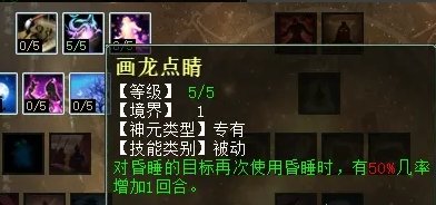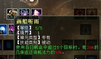 睡天赋第一排三个技能,分别是:画船听雨(任务、PK通用,睡中5个以上的单位,几率返还50%耗蓝),画龙点睛(任务、PK通用,再睡上被睡的单位增加1回合),迷花弄影(任务、PK通用,被G时,有几率自己摆脱)