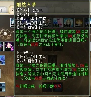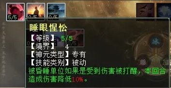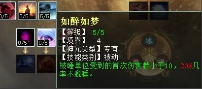 睡天赋第四排三个技能,分别是:睡眼惺忪(任务、PK通用,被睡单位被打醒,降低其输出伤害),泰然自若(任务、PK通用,连续5回合没出过睡,可增加忽视睡),如醉如梦(任务、PK通用,被睡单位受到首次伤害小于10时,几率不脱睡)