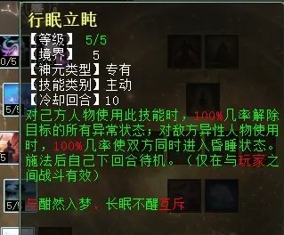 行眠立盹:主动技,对自己本方单位使用可解除其所有异常状态,对敌方单位使用,无视抗性睡必中。使用后待机一回合。冷却10回合。