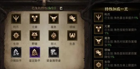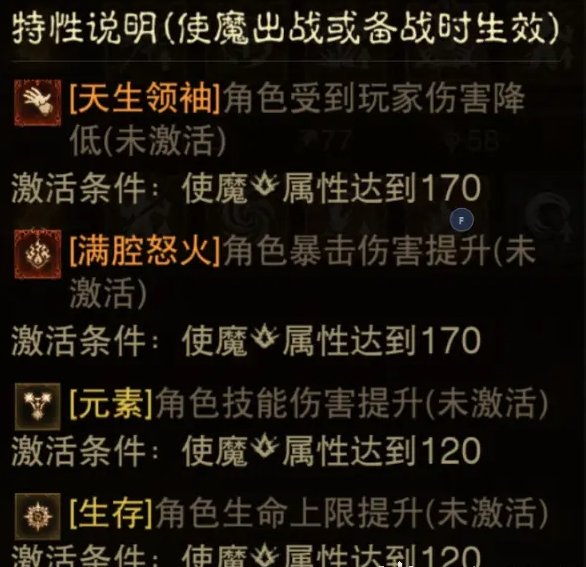 备战的使魔也可以生效特性,那么11个特性中8个属性类特性3个辅助特性是我们追求的其中一环,如果你全部拉满特性(普通玩家金色即可)就等于多了8个增益词条。